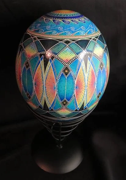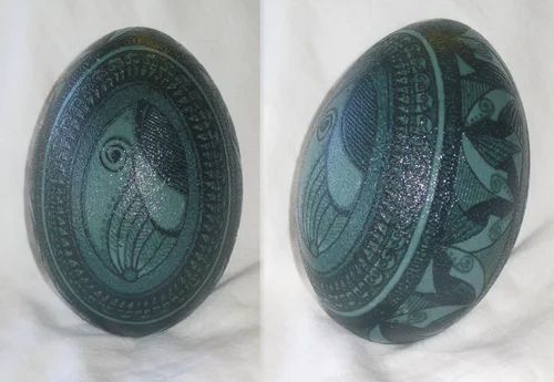 etched rhea egg. this egg was dyed black first and then the design was waxed on after the design was completed i used vinegar to etch the egg and wash the egg back to the natural shell color.